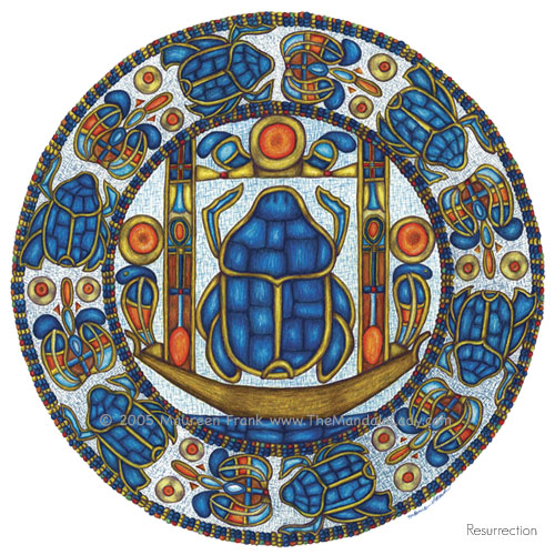 Prior to 2005 I had created two King Tut inspired mandalas. And by that time, I wanted to create another one. This one is my interpretation of a amulet/necklace worn by King Tut. The center scarab in this case represents Tut being carried off to the afterlife in a boat. The cobras and other scarabs are there to protect him on his journey.