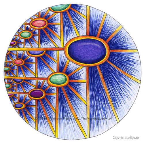 The “Cosmic Sunflower” mandala displays a simplified pattern (an oval with 8 protruding rays) repeated in fractal form in the upper and lower left sides of each ‘sunflower’, as it goes off the page into infinity.