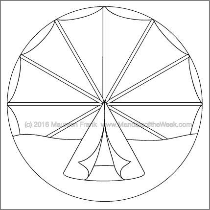 Inspired by yesterday’s Mandala of the Day, I incorporated the idea of a large umbrella into this mandala only in this case instead of it being parallel to the ground it appears to be hovering in the sky. Before us is a tepee like structure with its flaps open, inviting us in. The top of the structure could be seen as separate from the umbrella or attached…your call.